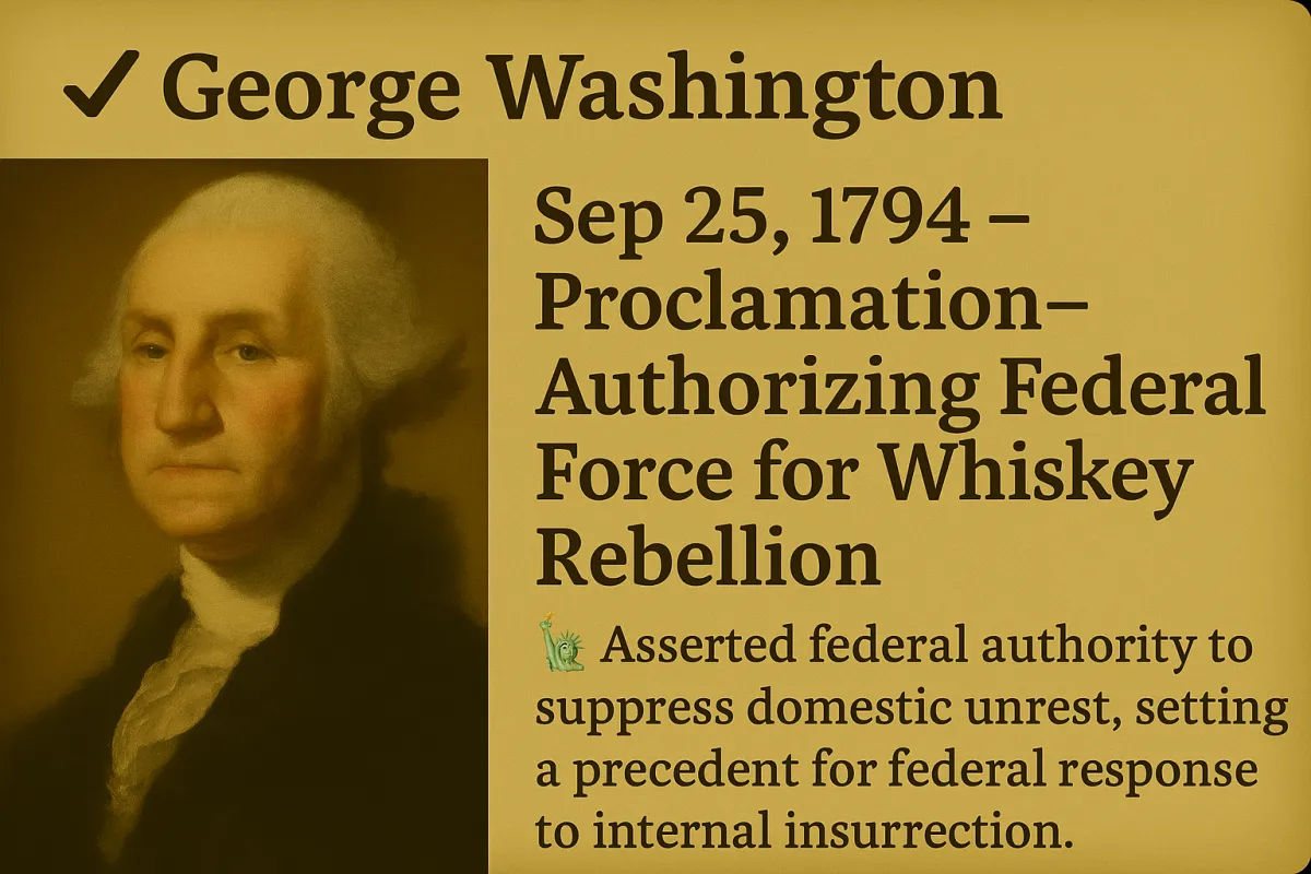 Proclamations: 30+ (including Thanksgiving, Neutrality, and Whiskey Rebellion)