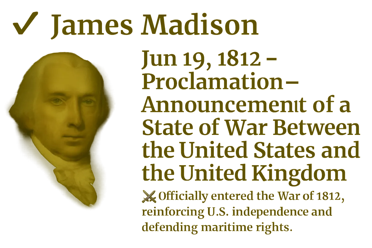 Proclamations: 20+ (War of 1812, public land, prayer)