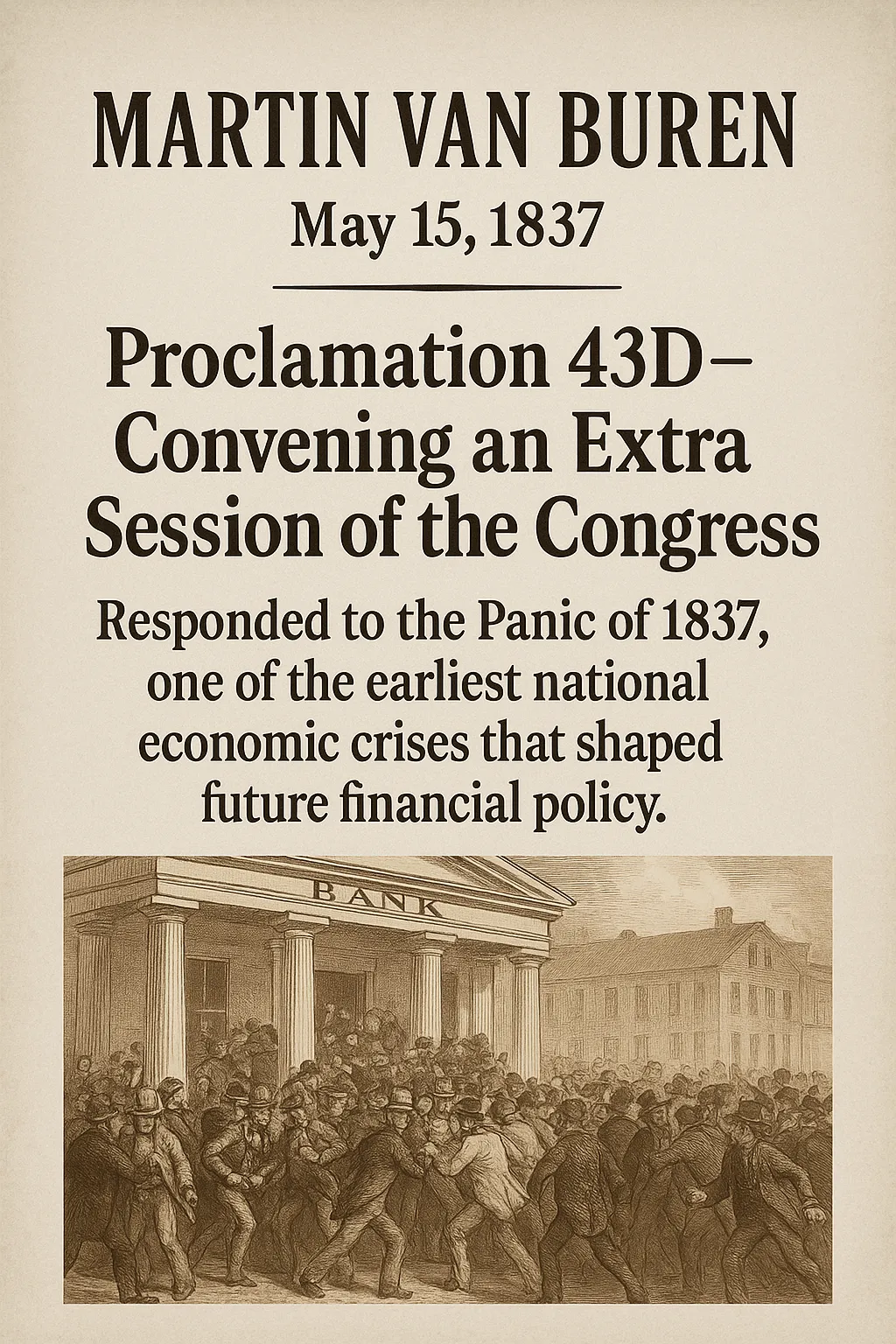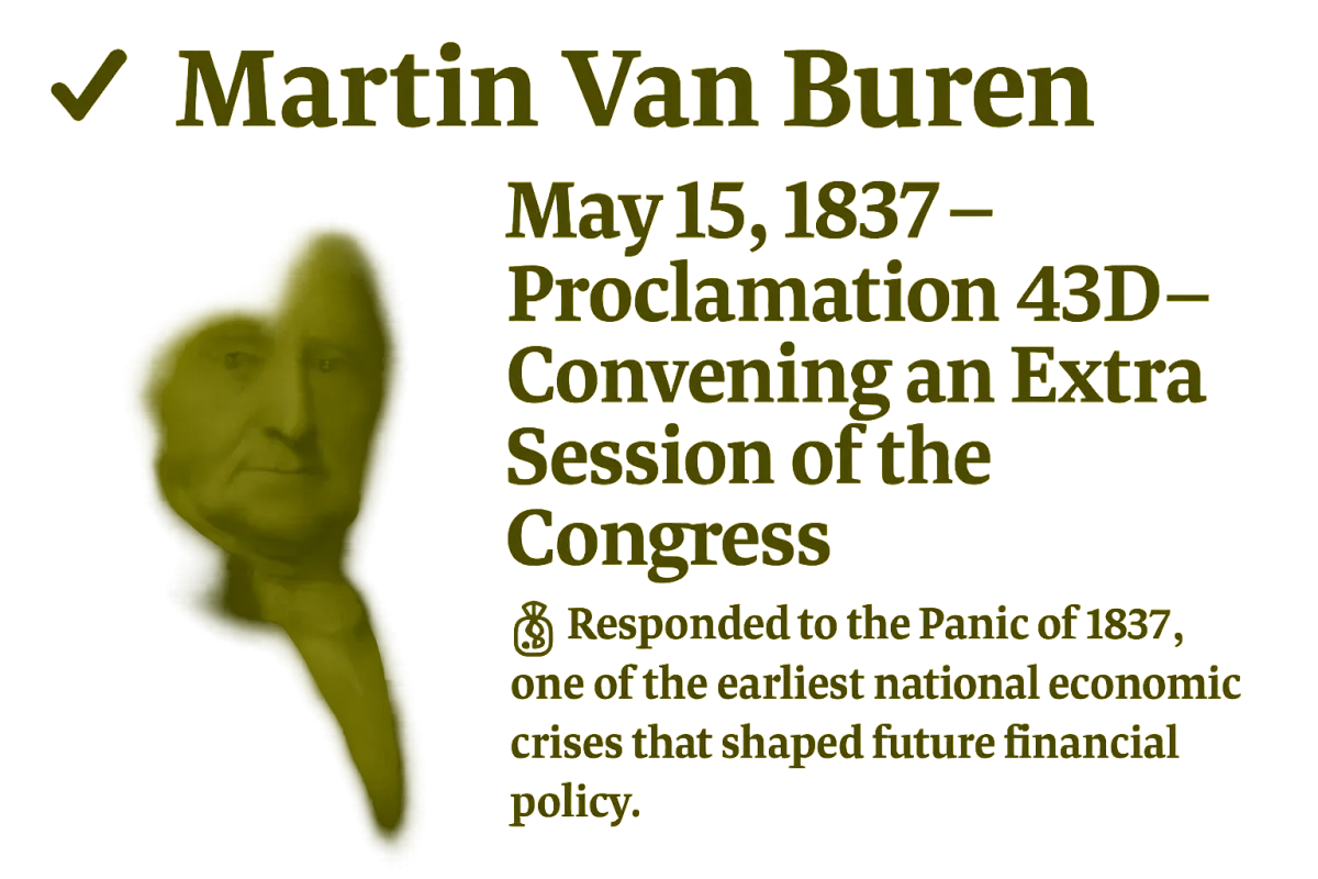 Proclamations: 10+ (Panic of 1837, Canadian neutrality)